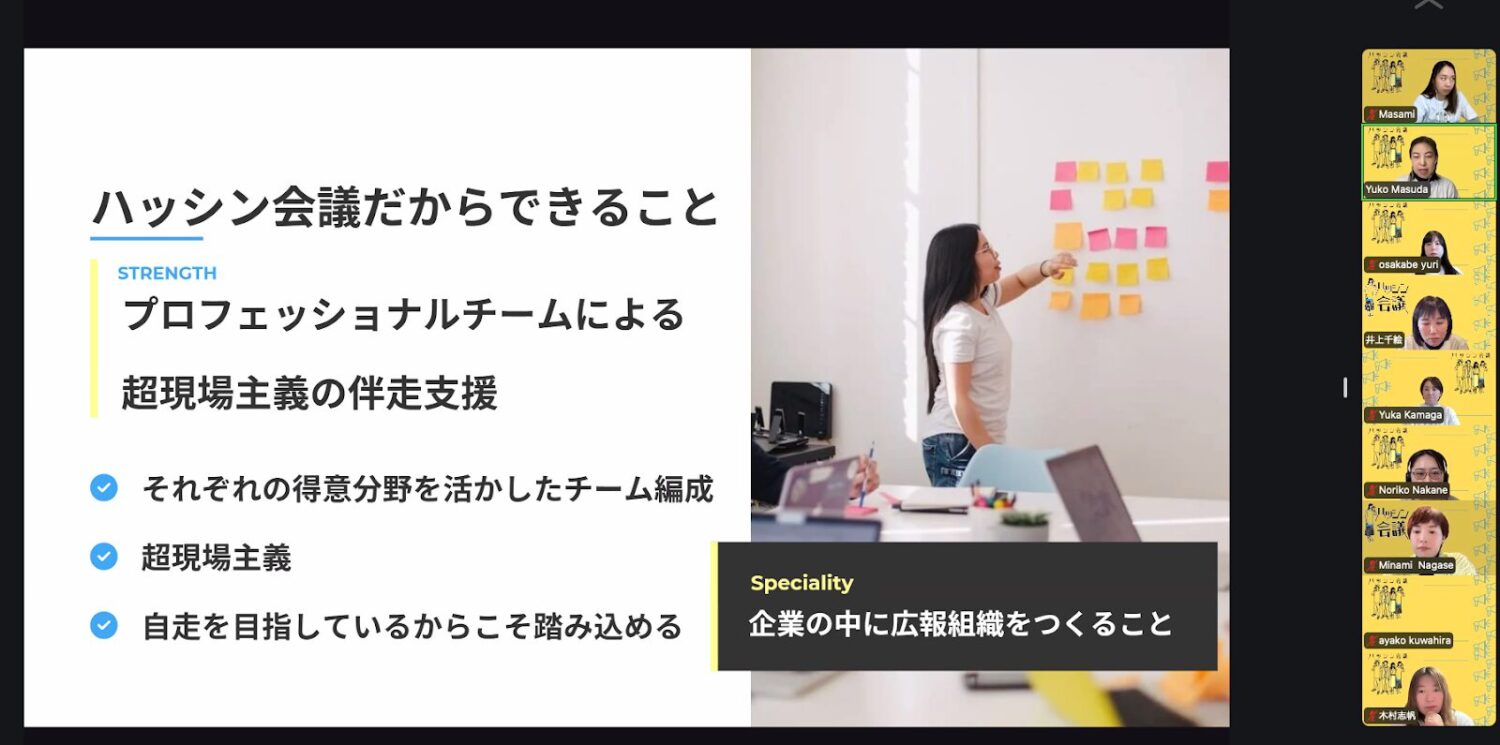 ハッシン会議では、メンバー同士のシェア会や、特別ゲストを招いたトークイベント、最新情報を共有したりしながら、日々広報スキルアップを目指しています。新規メンバーも先着順で募集中です!
