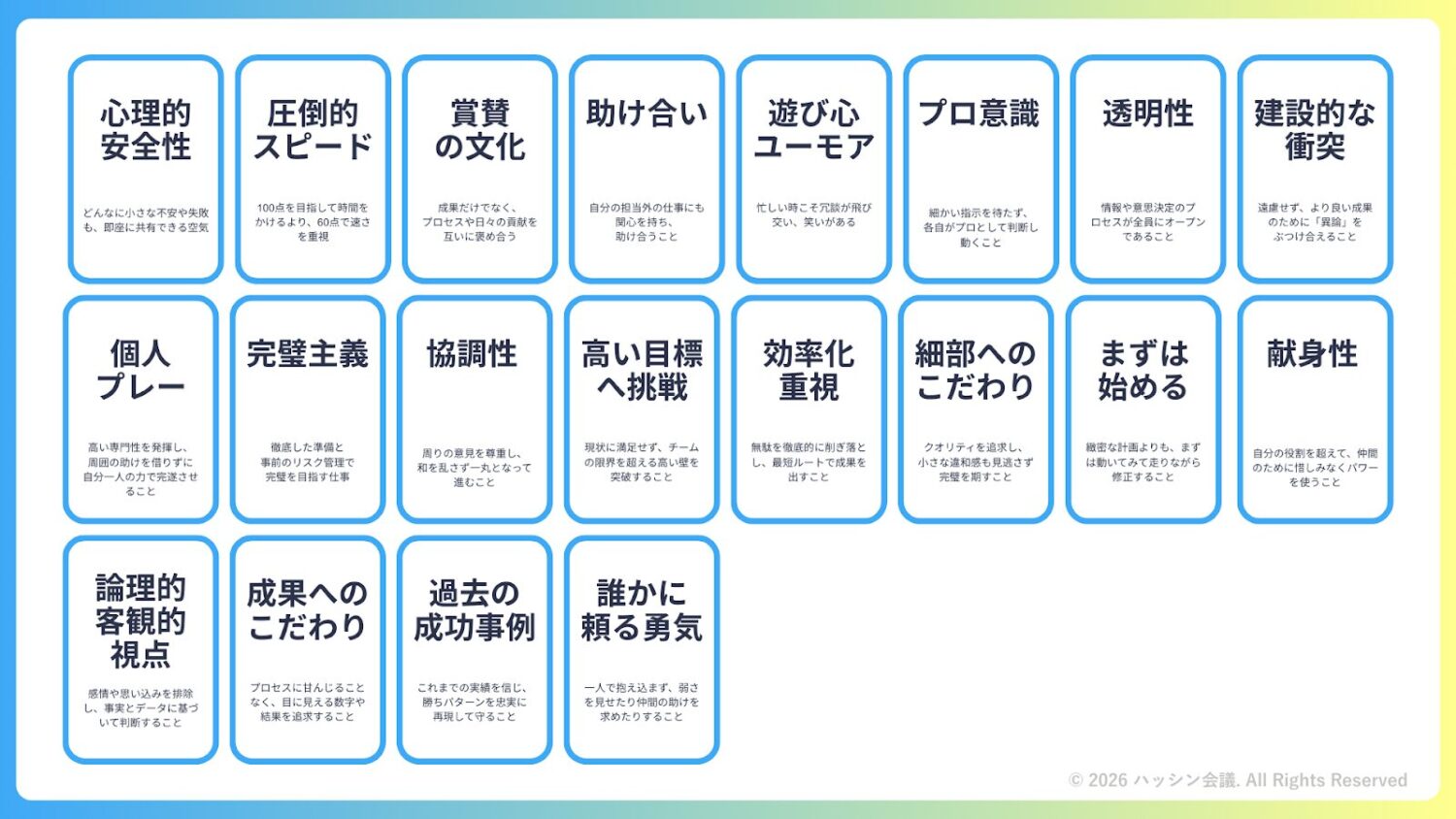 このワークは、20個の要素から 「最高のパフォーマンスを出すチームに不可欠な要素」として絶対に譲れないTOP3を決定し、逆に、もっと良い仕事をするために「あえてやめるべきこと」を議論し、「2026年は卒業する」ものを宣言するというものです。