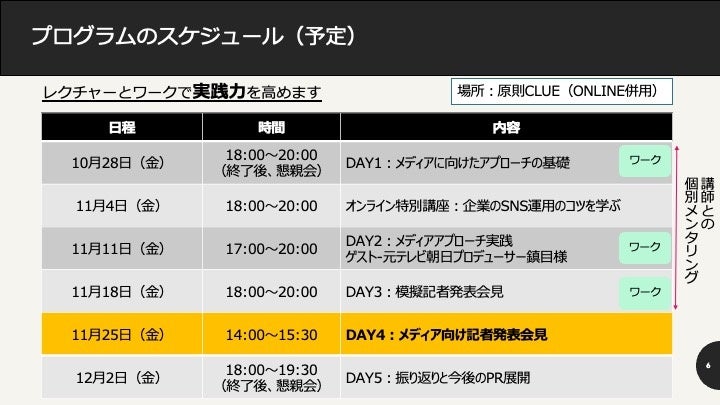 11月25日(金)に行われる予定の合同記者発表会見では実際にメディアの方をお招きし、それまでの学びの成果をメディアリレーションに繋げるプレゼンテーションの実践の場をご用意しています。
