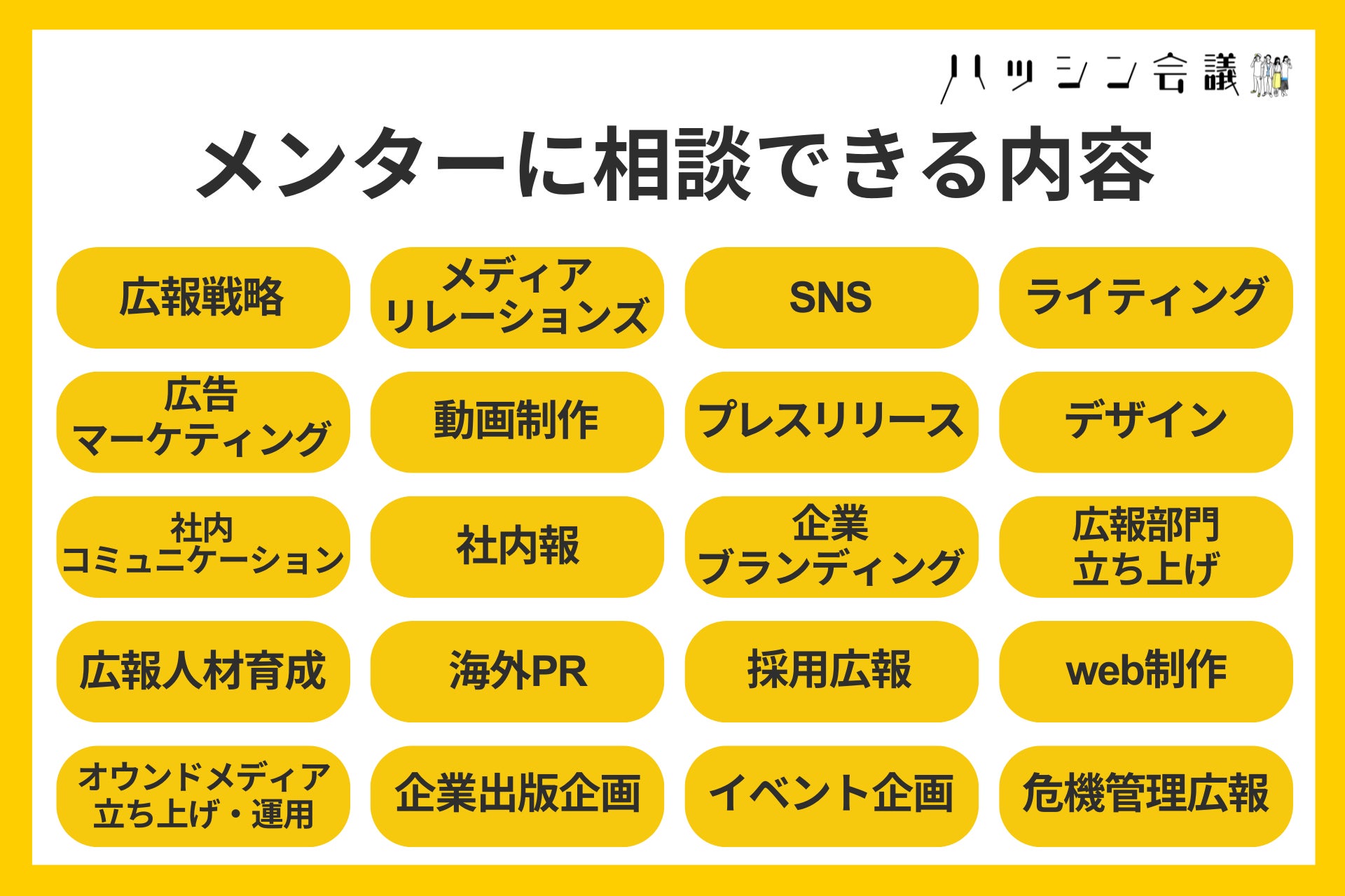 当社はこうした社会課題を解決すべく、2020年から100社以上の広報戦略策定・広報人材育成・組織開発に関わってきました。今回600回を超えた個別PRコンサルティングに対応すべく、多様な悩みに備えて、様々なキャリア・専門領域をもつメンターが在籍しています。