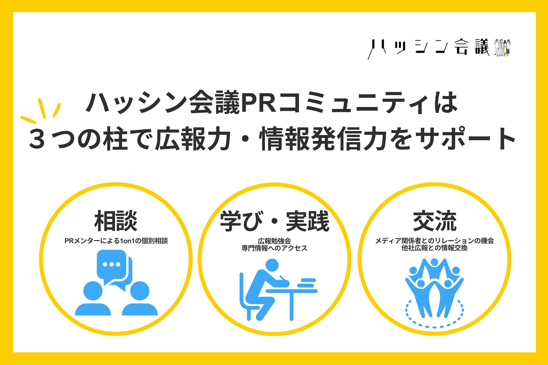 ハッシン会議では、メンバー同士のシェア会や、特別ゲストを招いたトークイベント、最新情報を共有したりしながら、日々広報スキルアップを目指しています。新規メンバーも先着順で募集中です!