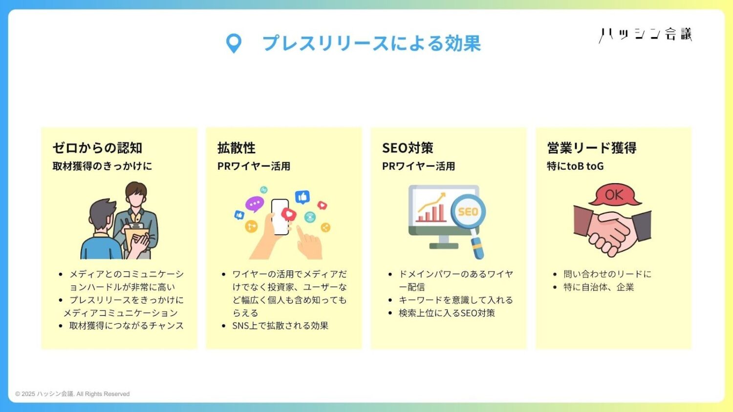 続いて、創業期のプレスリリースのポイントを、以下に沿ってご紹介しました。